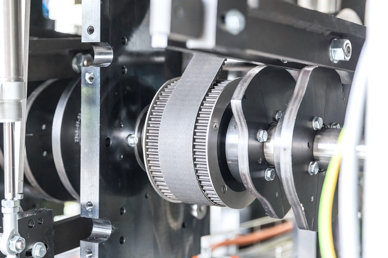 Unter dem Maschinentisch sitzt eine zentrale Welle, die von einem Elektromotor angetrieben wird. Bei größeren Anlagen können es auch mehrere Wellen sein, die über Zahnriemen synchronisiert sind.